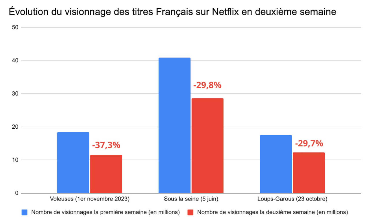 De même, Voleuses, de et avec Mélanie Laurent, attirait 11,6M d'abonnés sur la plateforme de streaming lors de sa seconde semaine, contre 18,5M pour la première en novembre 2023. Le nombre de spectateurs avait ainsi chuté de 37,3%.